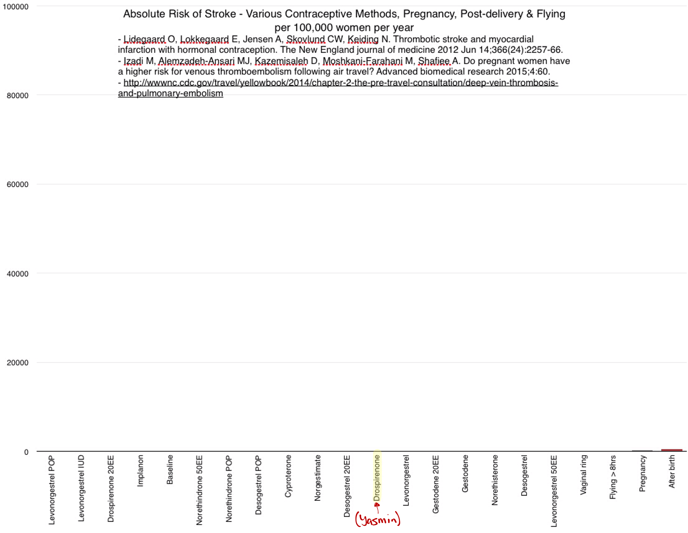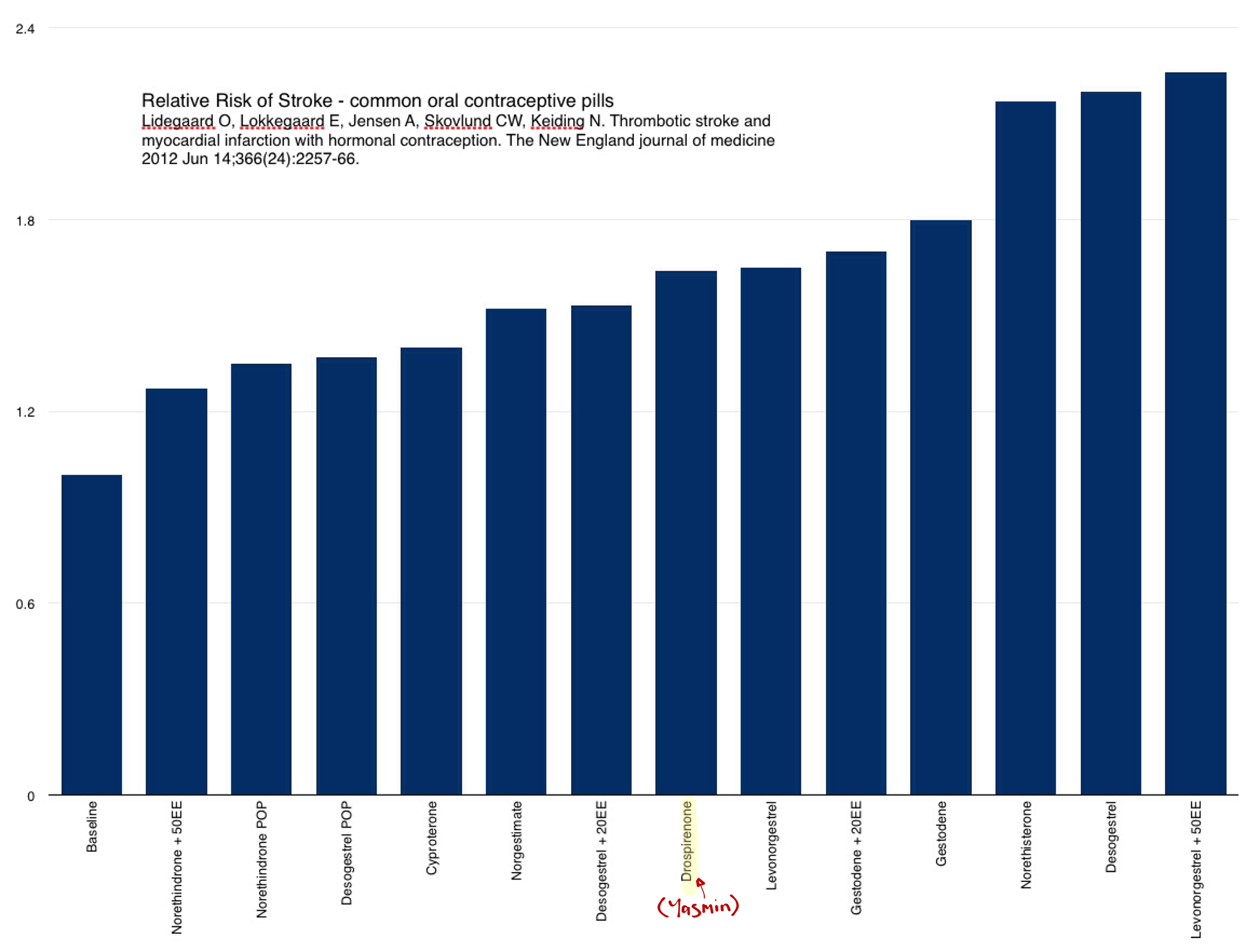 The graph shows that there are actually quite a few contraceptive pills that have a higher risk of stroke than Yasmin. According to the numbers of Lidegaard et al, Yasmin is not all that spectacular – just somewhere in the middle in terms of the risk of stroke, compared with common pills.