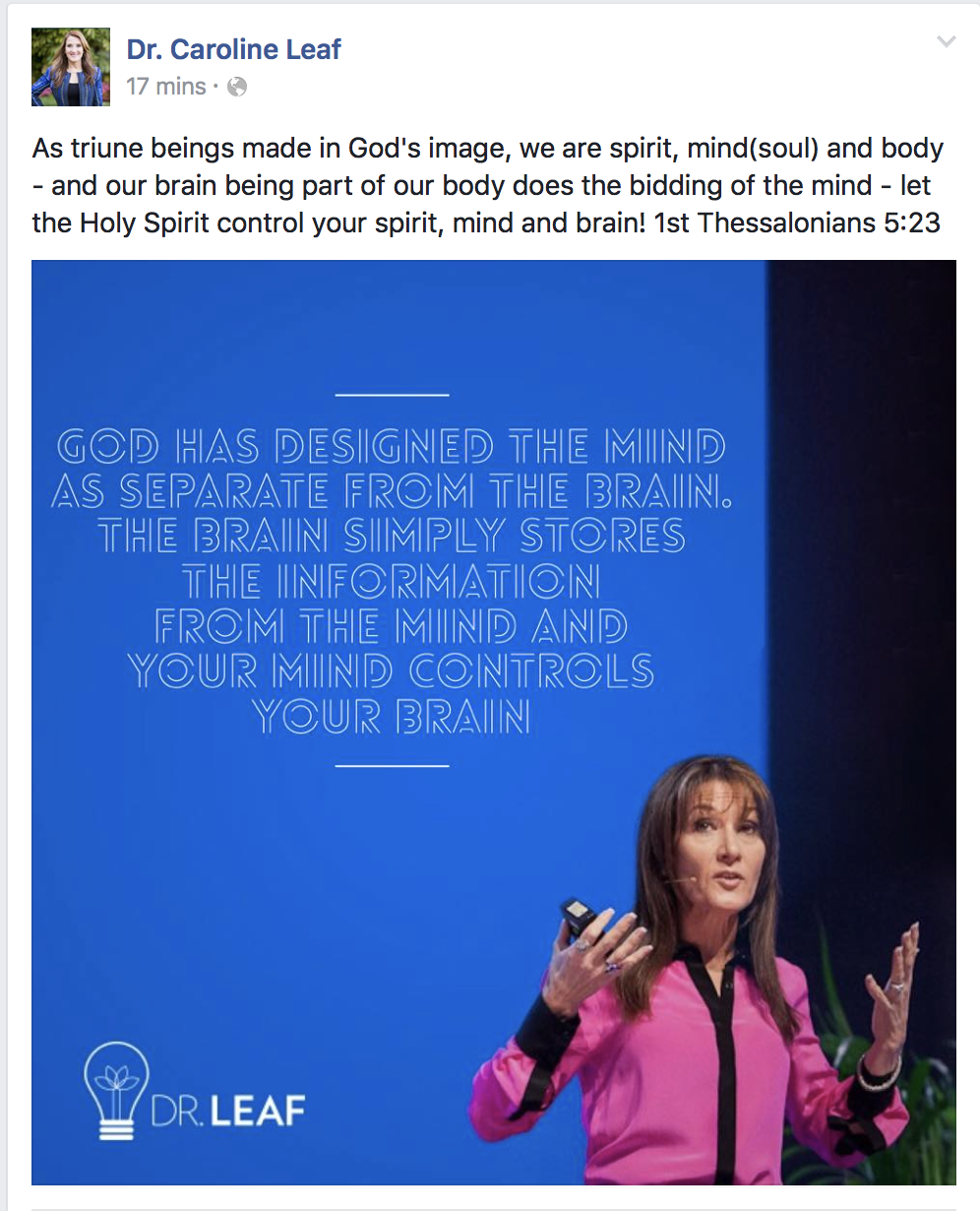 For years, Dr Leaf has taught that the mind is separate from and controls the brain through social media and through her books.  Take a meme she posted to social media in May 2016.  It said, “As triune beings made in God’s image, we are spirit, mind (soul) and body – and our brain being part of the body does the bidding of the mind …”, and “God has designed the mind as separate from the brain. The brain simply stores the information from the mind and your mind controls your brain.”