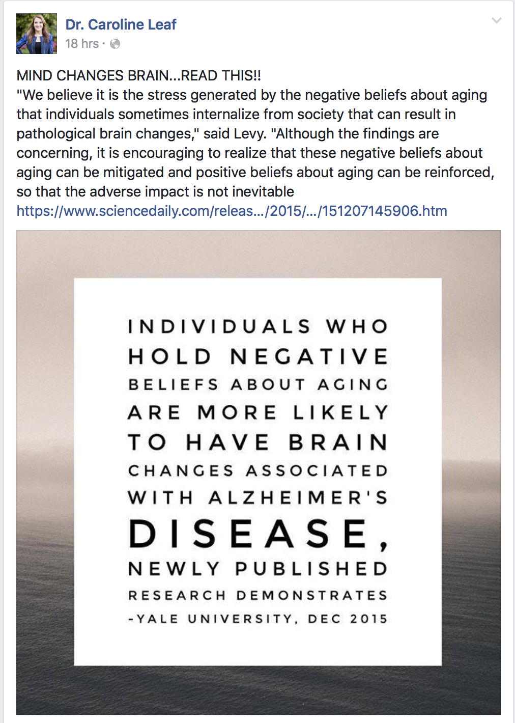 Today, Dr Leaf claimed that “newly published” research from Yale claimed that, “Individuals who hold negative beliefs about aging are more likely to have brain changes associated with Alzheimer’s disease.”  Except that this research is not really new since it was published last year, and Dr Leaf tried to draw the same tenuous conclusions then as she’s doing now.