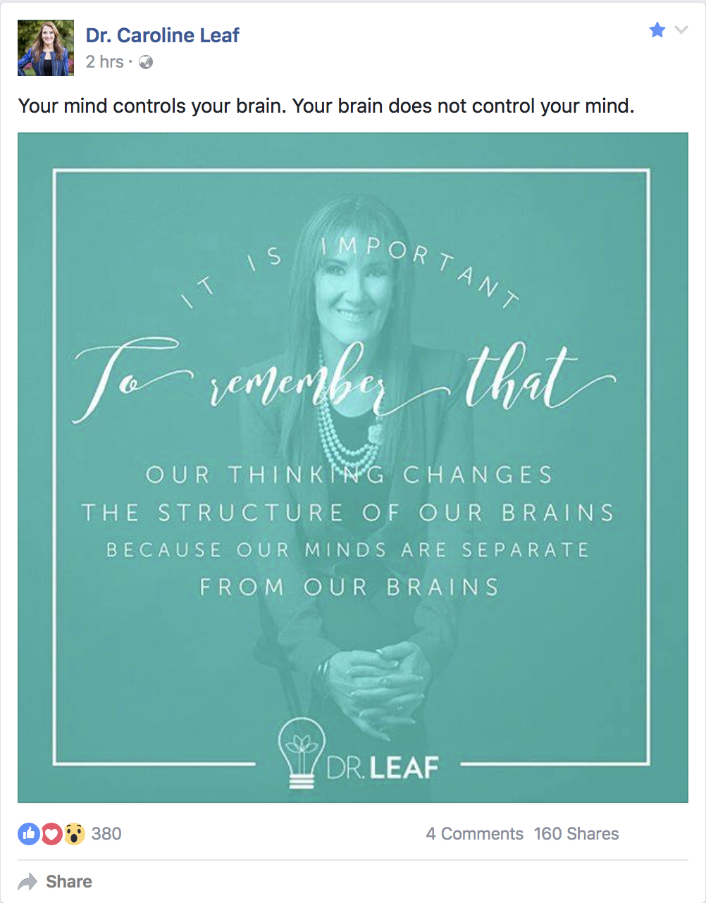 Dr Leaf can’t have it both ways. Real cognitive neuroscientists don’t constantly contradict themselves, tripping themselves up on the most fundamental of all facts. Dr Leaf needs to correct her most fundamental of all her assumptions and admit that the mind is a product of the physical brain and does not control the brain.
