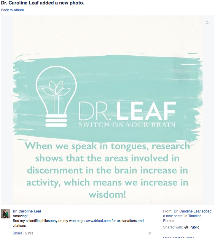 Dr Leaf’s Facebook factoid on the neuroscience of speaking in tongues is at least the second time she has posted it. In November when I first saw Dr Leaf’s proclamation on the science of speaking in tongues, I was fascinated. I went to find the research for myself to see if the areas involved in discernment in the brain really increase in activity when speaking in tongues. As it turns out, there isn’t any.