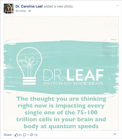 Following hard on the heels of her false assumption that our minds control our health, not our genes, and following the same theme, Dr Leaf had this to say today, “Everything is first a thought; the brain is being controlled with EVERY thought you think!”
