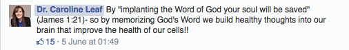 Dr Caroline Leaf is a Communication Pathologist and self-titled Cognitive Neuroscientist.  Not content to completely misinterpret James 1:21 only once, she posted on social media today, “James 1:21.  Our thoughts and perceptions have a direct and overwhelmingly significant effect on the cells of our body.”