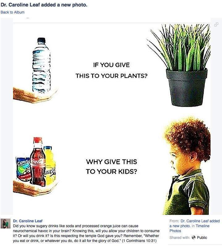 I was entertained somewhat by Dr Leaf’s latest Facebook post this evening. In it, there was a pairing of water and a pot-plant, and sugary drinks and a child, with the words, “If you give this (water) to your plants? Why give this (sugary beverages) to your children.”